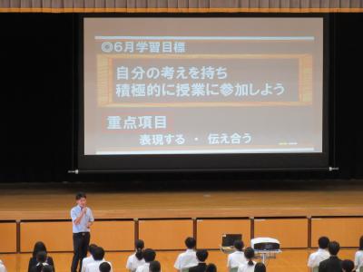 本日より6月が始まり、定例の全校集会で頑張ることの確認をしました。集会冒頭には、校歌の練習がありますが、今回は3年生男子2名が全校生徒の前で歌声を披露する場面もありました。