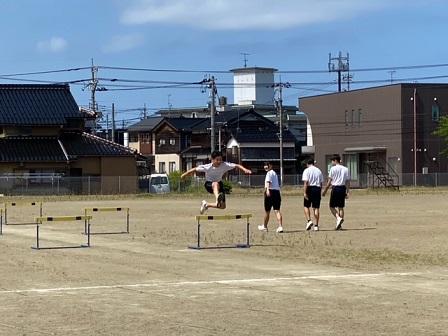 この学級は、ハードル走が上手な生徒が多く、膝を折りたたむことが難しい抜き足もとてもスムーズです。次はタイム測定です。今週はとても爽やかな気候が続いており、生徒は何度もチャレンジしていました。