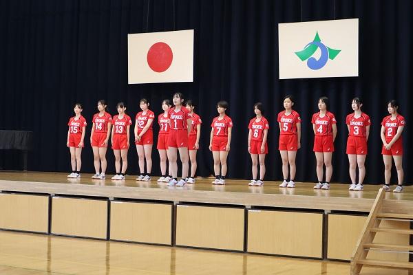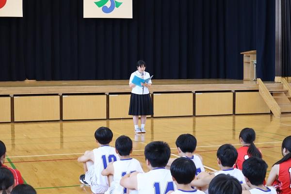 各部の選手がユニフォームを着て、吹奏楽部の演奏で颯爽と登場しました。顧問の先生から選手紹介があり、各部長からは大会に向けた抱負が述べられました。生徒会書記と校長先生からの激励の言葉の後に、女子バレーボール部長から「このような激励会をして頂き感謝しています。大会当日は一生懸命頑張ります!」と力強い挨拶がありました。
