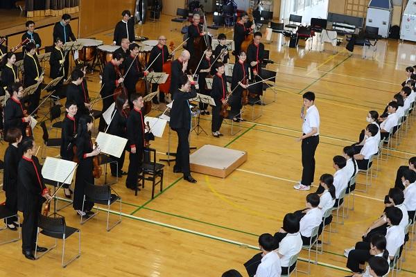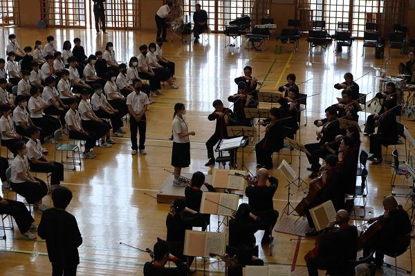 今回は、7曲(+アンコール2曲)を演奏して頂き、生徒が聞いたことのある曲が多く、あっという間の1時間でした。曲と曲の間に楽器の紹介や作曲者がどういう思いで作った曲なのかなどの説明があり、全校生徒で楽しむことができました。また、吹奏楽部の2年生と男子剣道部主将が指揮者体験をし、大変盛り上がりました。