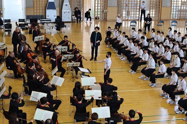 本日、「石川県オーケストラ鑑賞教室」として、オーケストラ・アンサンブル金沢の皆さんによる演奏会が本校体育館で行われました。この演奏会は、毎年市内中学校で開催されており、今年度は宇ノ気中での開催となりました。
