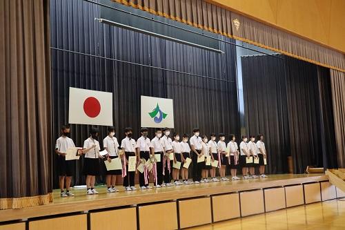 先日行われた少年剣道大会、河北郡市陸上大会の表彰伝達が行われました。また、生徒会から6月の取り組みについて説明がありました。