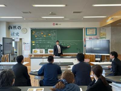 放課後、教職員の校内研修が行われました。澤先生が先生役をし、先生方が生徒となり授業を行いました。市教委から、竹森指導主事が来校され、授業や指導案作成のポイントについて指導していただきました。