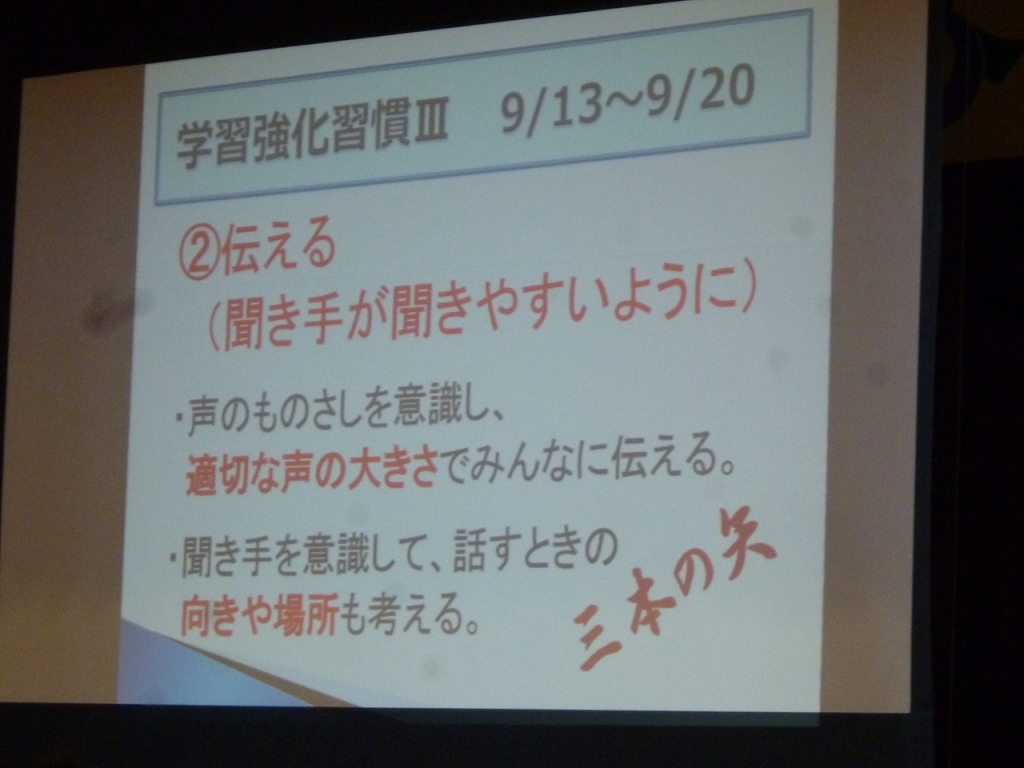 2学期の授業は「表現する」「伝える」「聴く」に重点を置いて授業を行っていくというお話がありました。その上で、「インプット3割、アウトプット7割」が脳にとって「最も記憶に残りやすい暗記の割合」であること、自分の考えを表現することで学んだことの定着をより確かなものにすることを学ぶことができました。