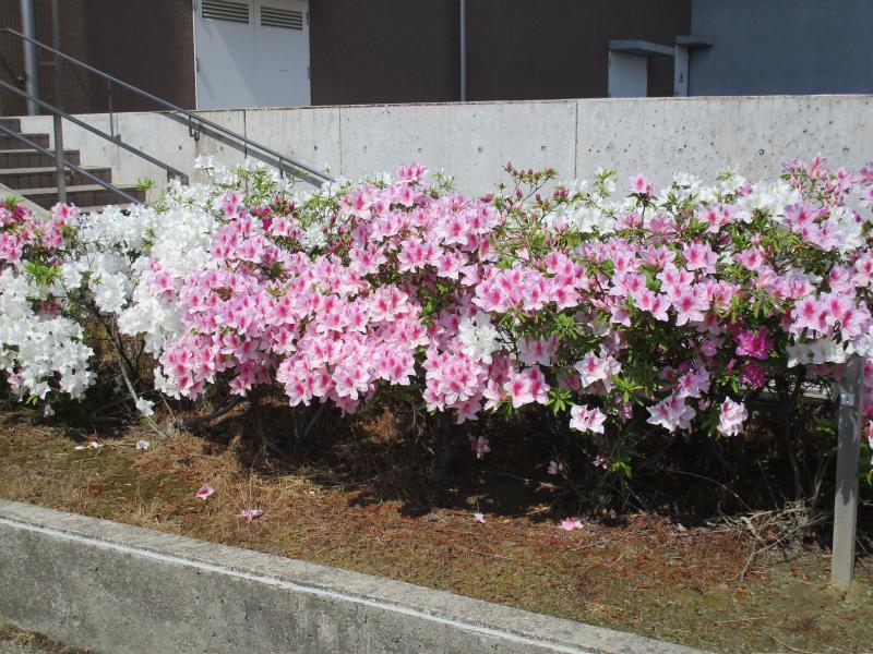 現在、春真っ盛りという感じで、校舎の前では、緑が風に揺られ、駐車場からのスロープの両側に「ヒラドツツジ」がいっぱい咲き並んでいます。いつもの年ならば、このヒラドツツジの間を通って生徒たちが登校します。今はその姿はありませんが、ヒラドツツジもそれを待ち望んでいるかのように満開の状態です。