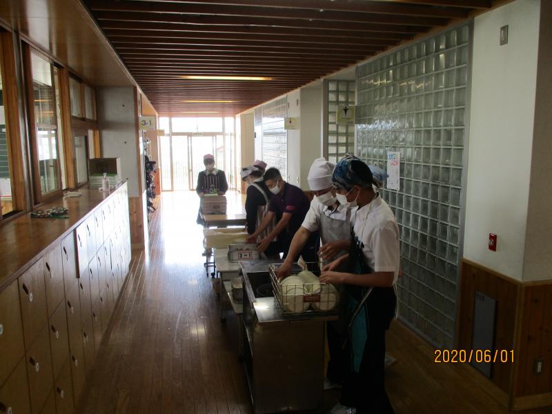 給食の様子です。密集を避け、廊下で盛り付けをしています。