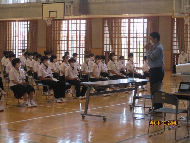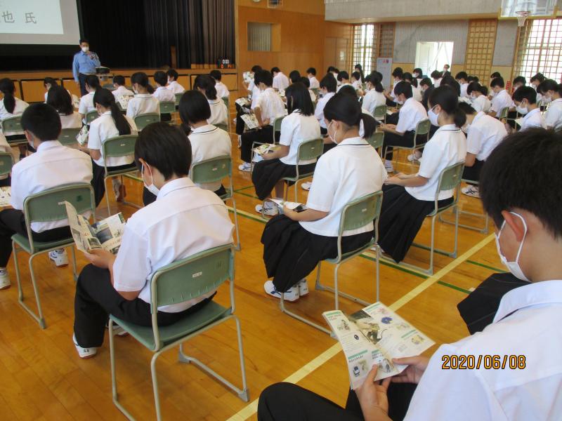 また、5限目には1年生だけの交通安全教室を行いました。例年、自転車の乗り方指導をしていただいていますが、(新型コロナウイルスの関係で)今年は体育館で交通安全のお話を聞きました。
