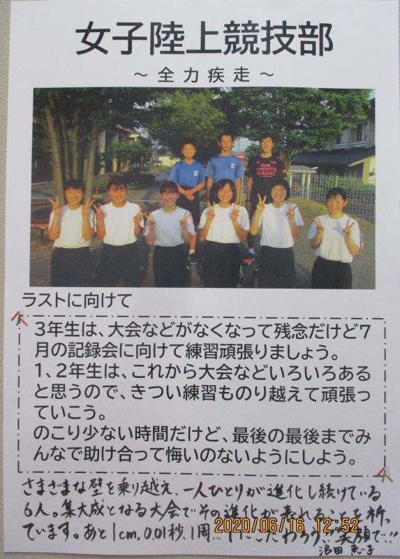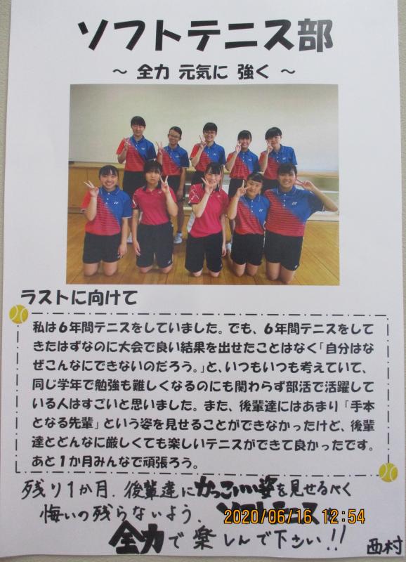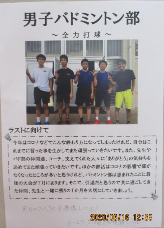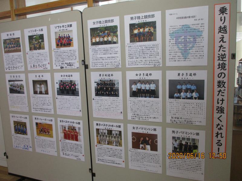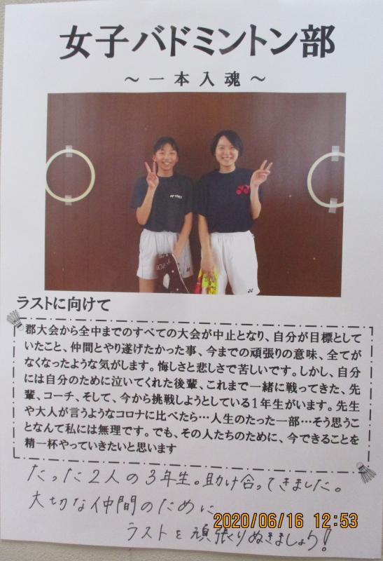 『2ヶ月間に及ぶ長い休校期間が明けました。元気に過ごせていたでしょうか。誰にとってもかけがえのない2ヶ月を奪われた悔しさと、やっと始まる期待とで複雑に感じていることと思います。部活も大きな大会は中止。多くのメディアは言います。「次につなげて」、「前向きに捉えて」、そんな言葉が中学生の私たちにとって重荷になってしまうかもしれません。
