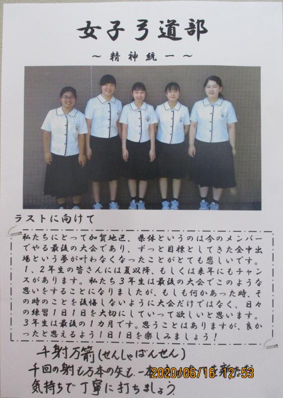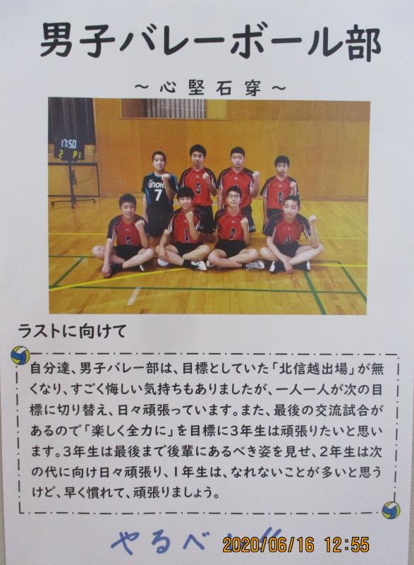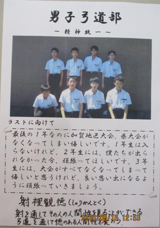 中学校体育連盟(中体連)より部活動の大会が中止になったことはご存じのことと思います。3年生にとっては、最終学年となった今年、各種大会で活躍しようと強く思って、ここまで練習してきたと思います。しかし残念ながら、加賀地区予選大会から全国大会まですべての公式大会が中止になりました。