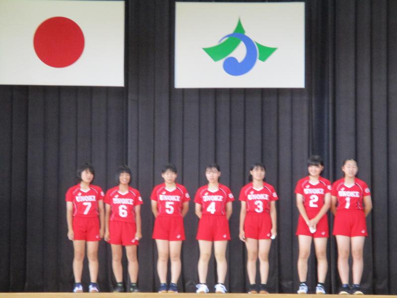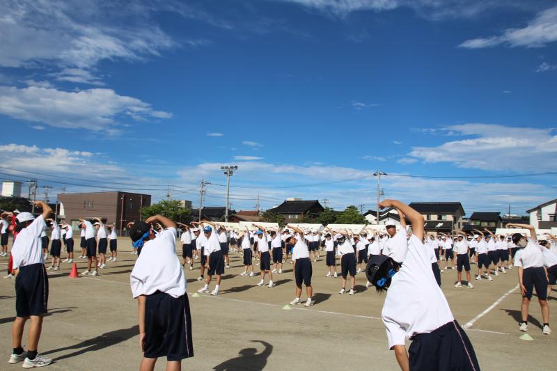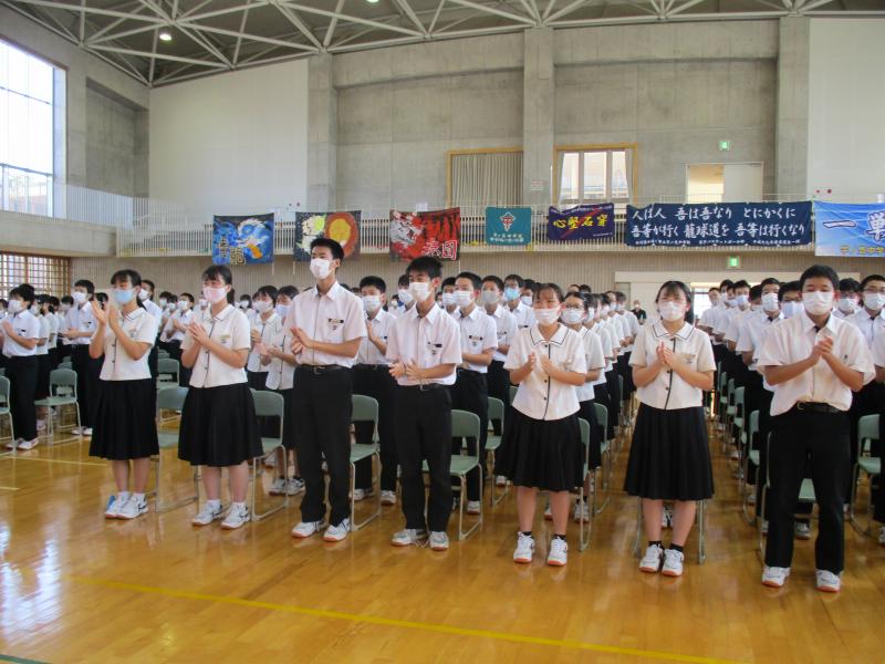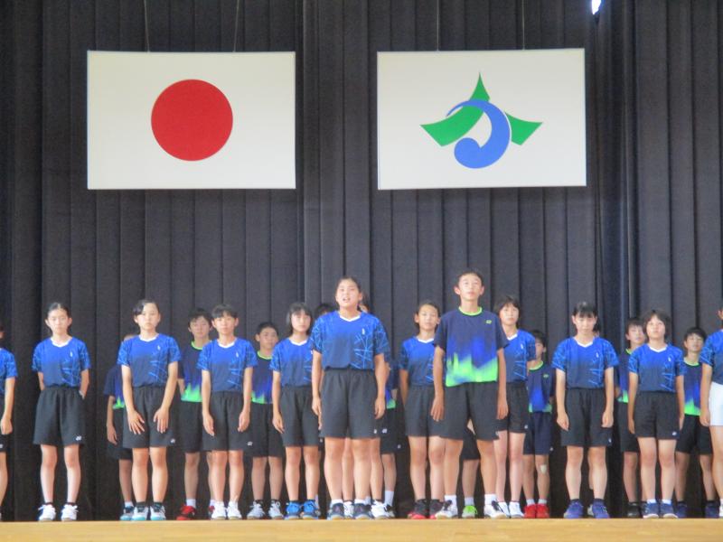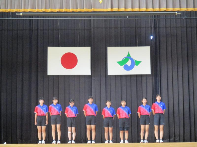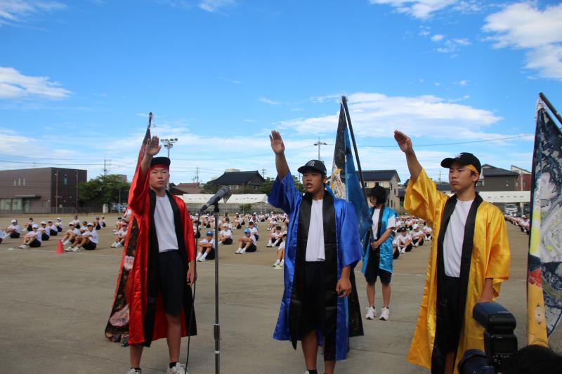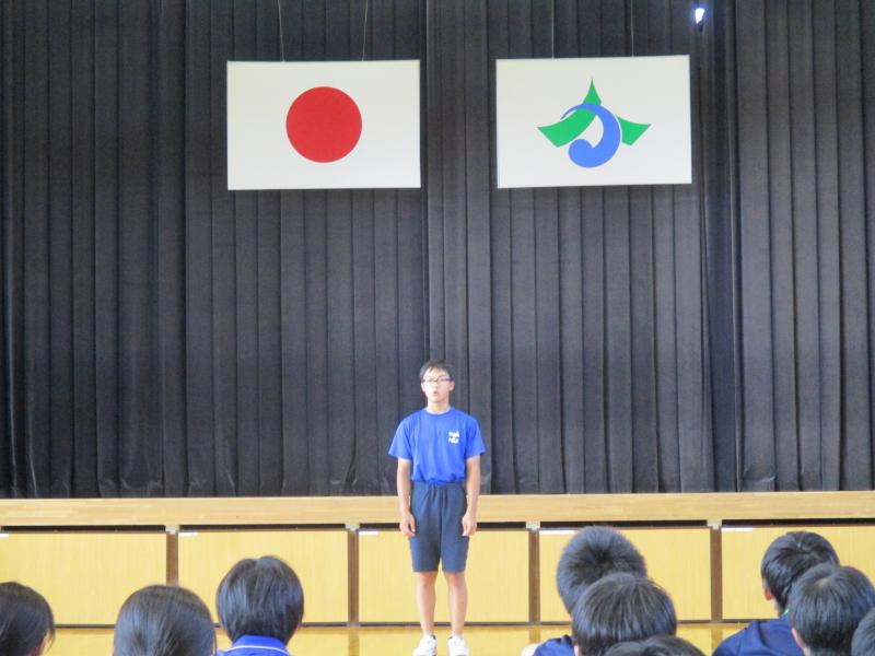 選手を代表して、男子陸上部の鮒田 宙樹くんが元気よくあいさつに立ち、3年生の分まで頑張ることを宣言してくれました。どの選手も、どの部活動も全力を出し切り、優勝、自己ベストを目指して最後まで戦い抜いてください。応援しています。
