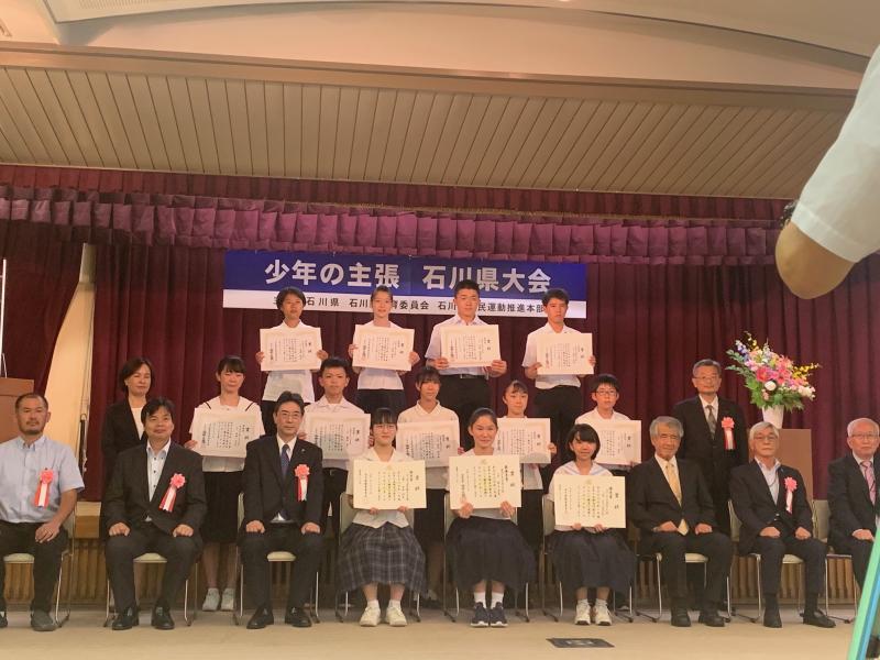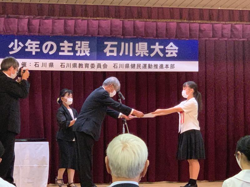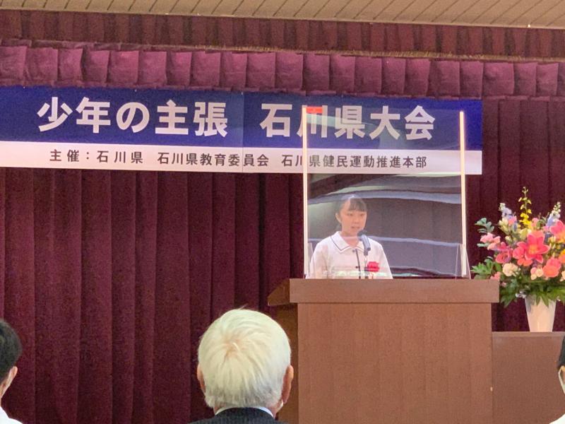 8月30日(日)、少年の主張石川県大会が行われ、本校から3年1組數馬すずかさんが出場しました。各地区からの代表者が集まって行われた県大会では、どの弁士も立派な内容の主張を繰り広げました。出場者12名中、數馬さんは奨励賞を受賞しました。