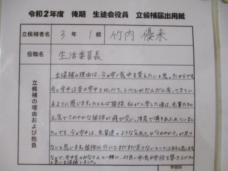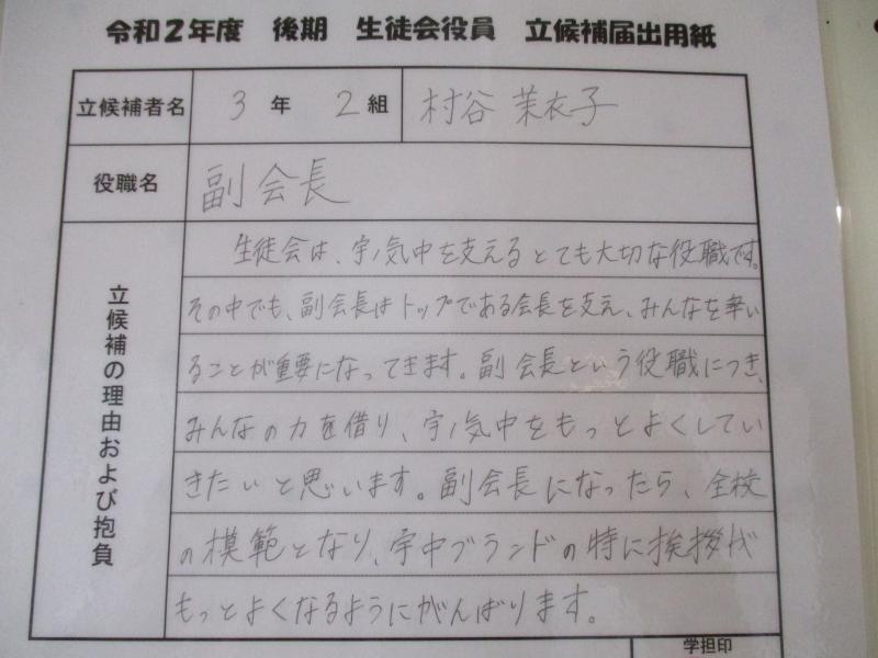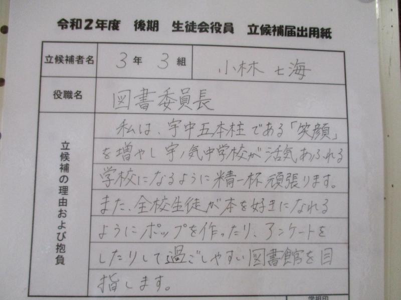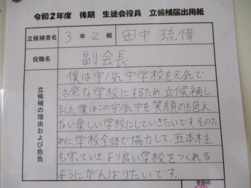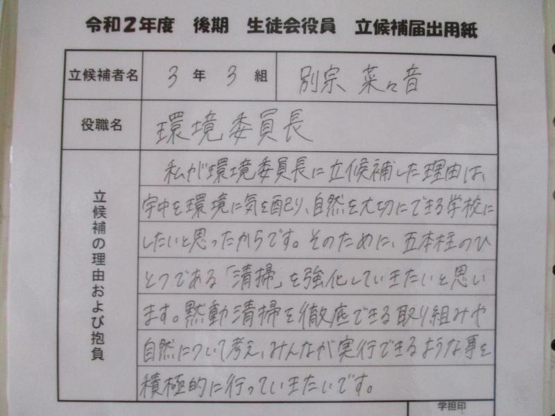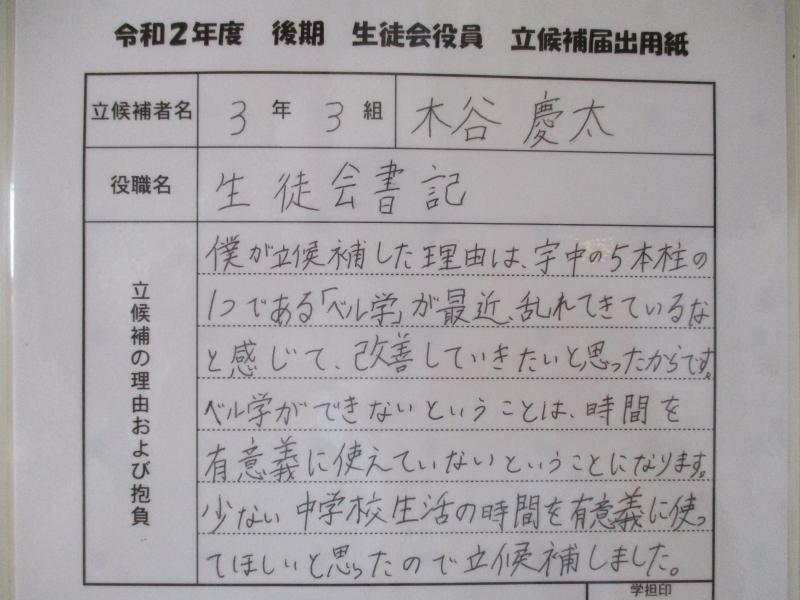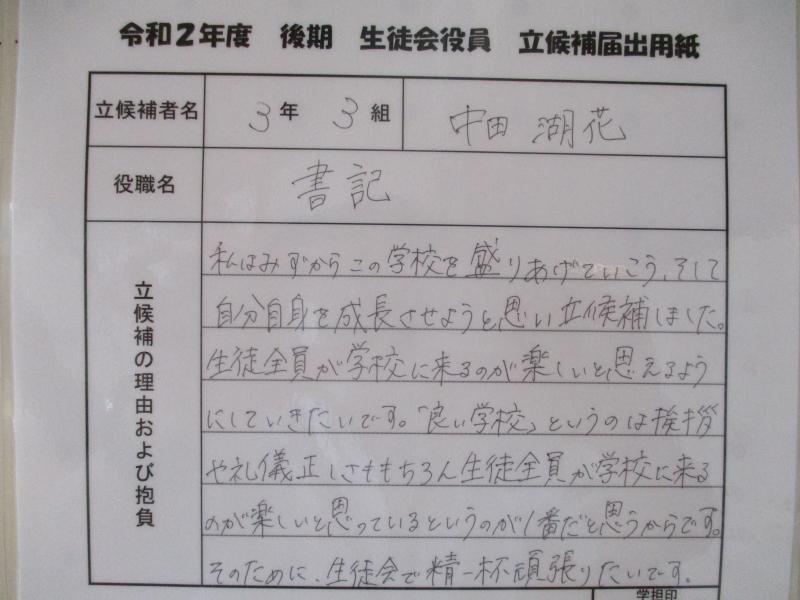 立候補者14名の生徒会にかける思いがあふれています。明日の立ち会い演説ではその熱い思いを全校生徒にアピールしてほしいと思います。