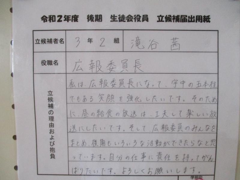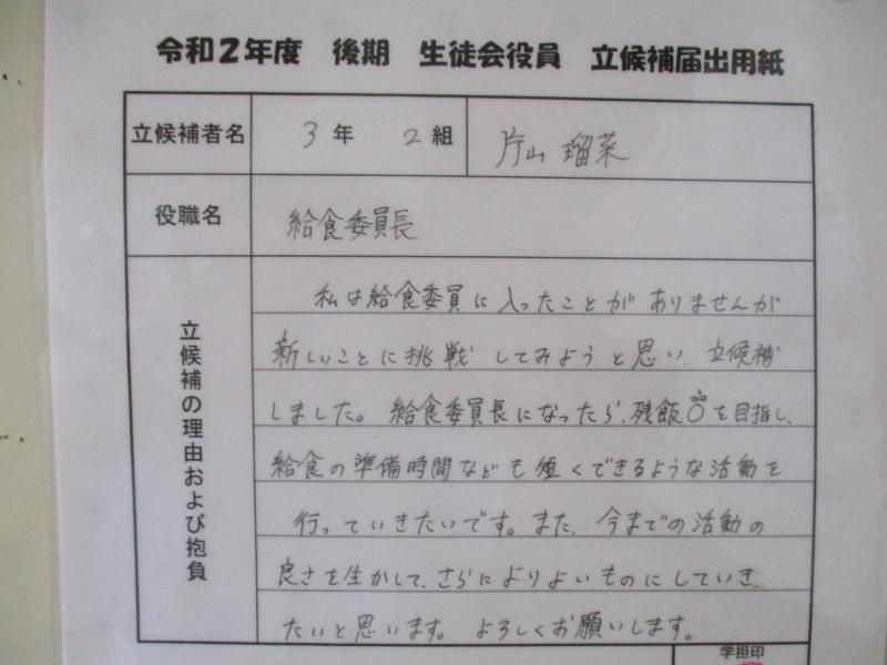 明日午後、後期生徒会役員選挙 立ち会い演説ならびに投票が行われます。後期生徒会の役職には14人が立候補しました。
