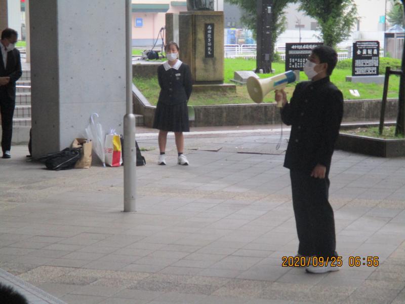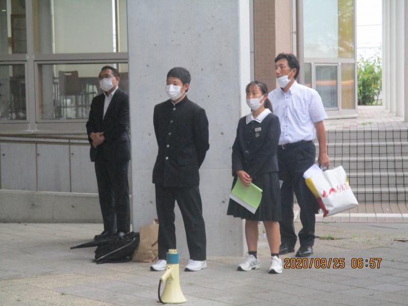 選挙運動をしながら、登校する生徒にあいさつをしています