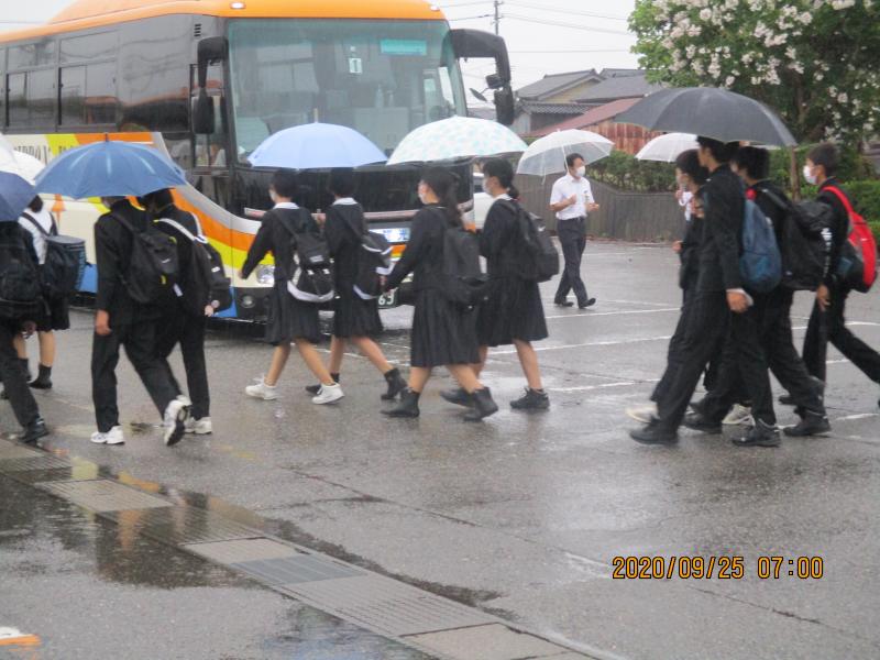 本日、3年生は修学旅行の代替ということで、バスにて福井県まで校外学習に出発しました。天気はあいにくの雨ですが、朝はどの生徒もわくわく感に満ちた表情を見せてくれました。楽しい思い出となるよう、福井(福井恐竜博物館、大野市(大野城)散策、永平寺)での学習を深めてほしいと思います。