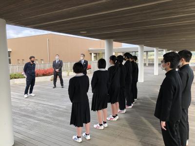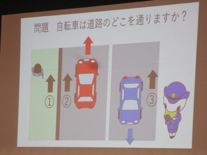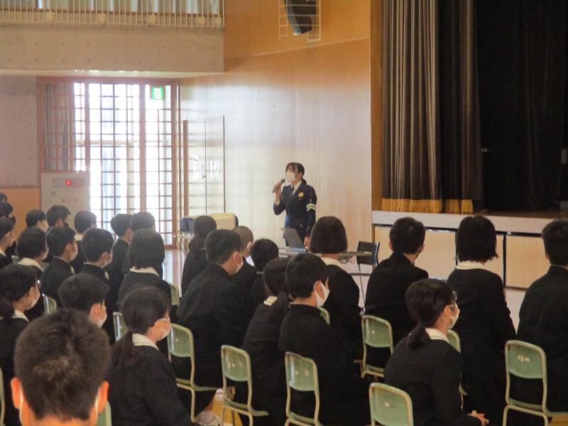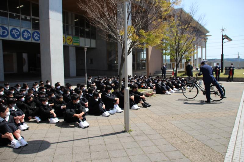 全学年、交通課長の方から、自転車の乗り方、歩道と車道の歩き方についての講話がありました。生徒達は真剣にお話を聞いていました。