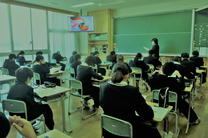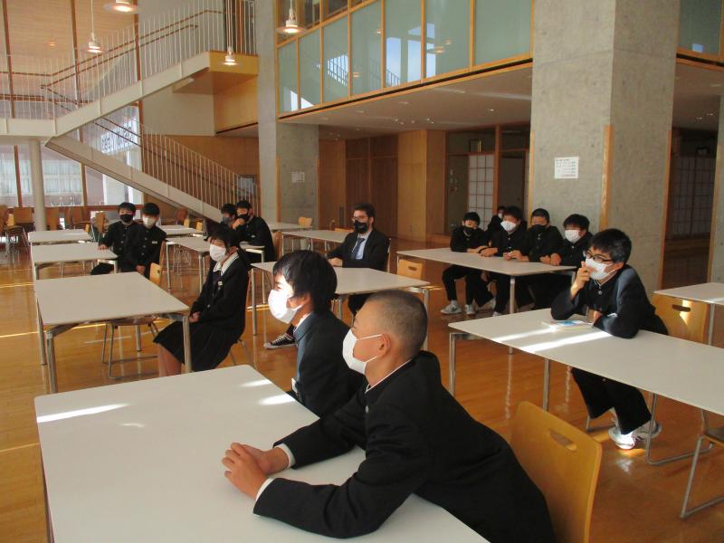 「かほく市のまちづくり」と題して『海と緑に抱かれたにぎわいのまち』の実現に向け、かほく市が行っている取組などについて授業を3年生に行っていただきました。