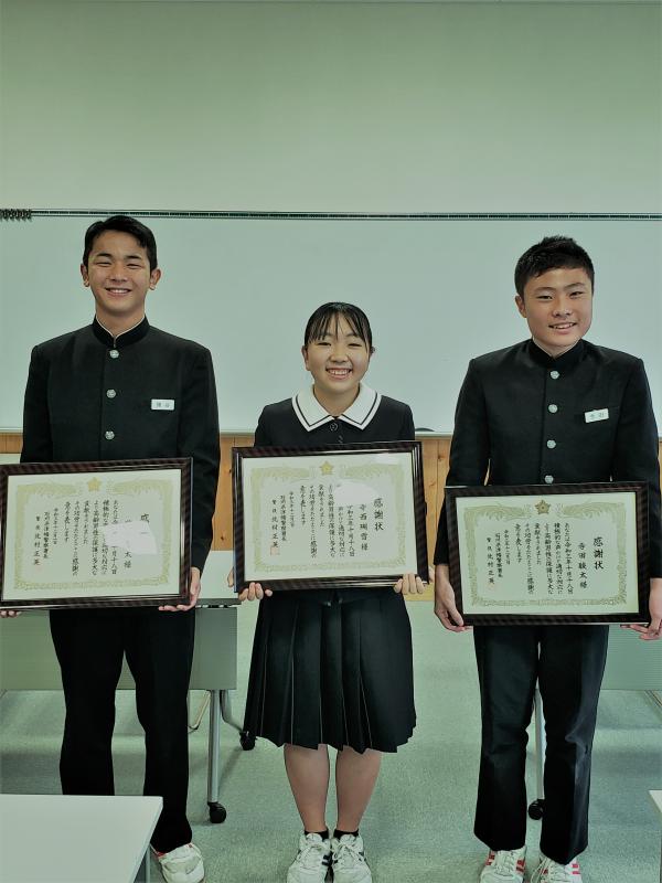 既に、新聞等でご存じの方もいるかと思いますが、昨日、本校の3名の生徒に、津幡警察署より感謝状が贈られました。10月18日の出来事です。転倒し困っていた高齢者の方に対して声をかけ、背負って助けてあげたそうです。高齢者のご家族の方々はとても感謝しました。