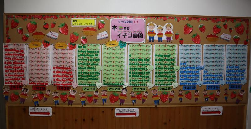 5月9日から27日まで「クラス対抗!!本deイチゴ農園」を図書室で行っています。