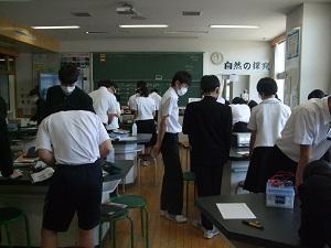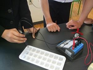 3年生の理科授業です。今は、化学分野「イオン」の学習に入ったところです。保護眼鏡をかけ、実験後には必ず手を洗うなど安全に留意しながらの学習です。