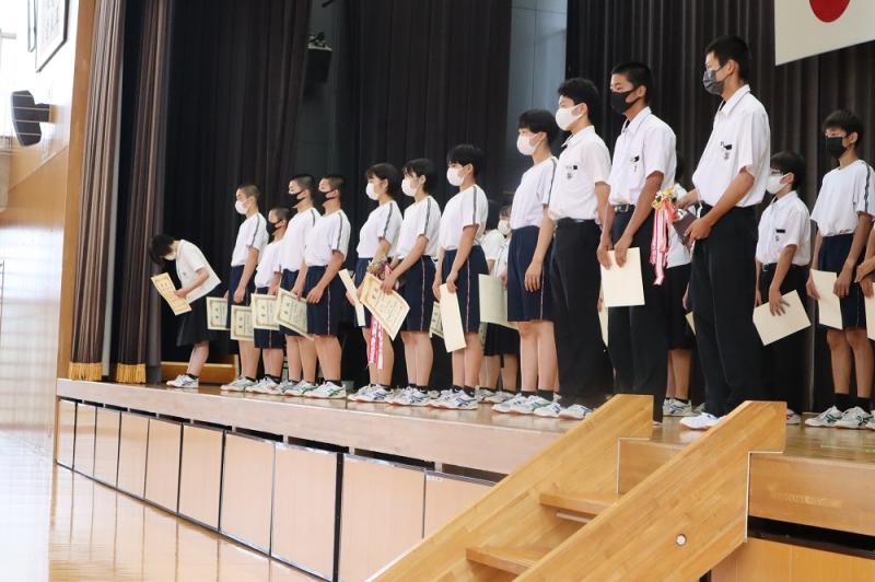 表彰伝達では、加賀地区大会で活躍した多くの生徒がステージに上がっていました。