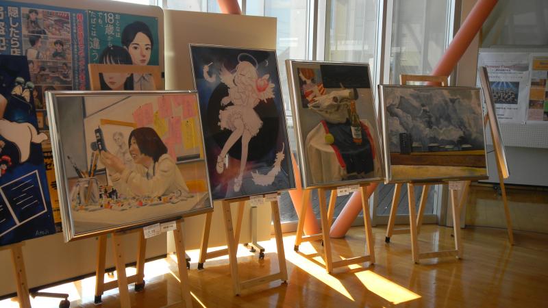 生徒玄関ホールに金沢学院附属高校芸術デザインコースの生徒作品が展示されています。どれも力作ですね。