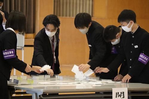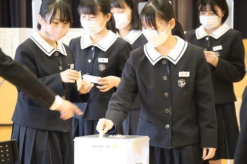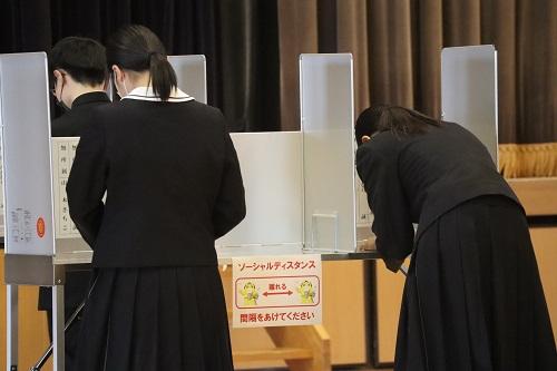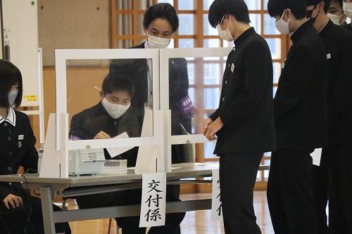 市の選挙管理委員会の方から選挙についてのお話を聞いた後、模擬選挙で投票を体験しました。