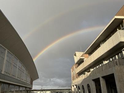 二重の虹を見て、生徒は「ラッキー!」「何か良いことが起こるかも」と喜んでいました。