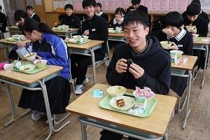 給食をおかわりする生徒はカレーやパンなどの多くの給食に喜んでいました。