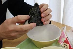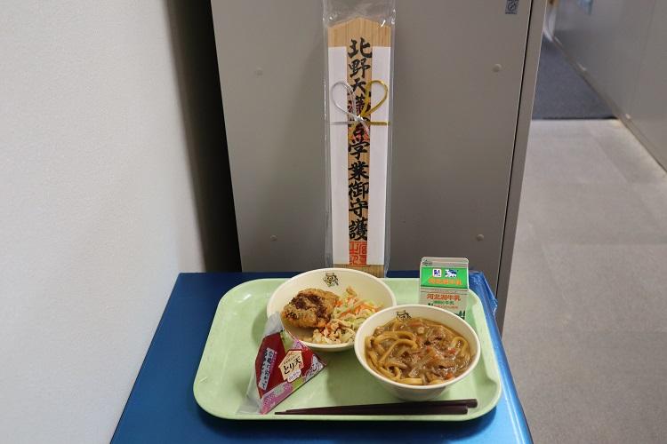 本日の給食は、「記憶力抜群!青魚フライ キャベツの必勝があえ 受かれーうどん」と「米心石川さんからの受験生応援プロジェクトのとり天おにぎり」でした。「とり天」には「点を取りに行く」という意味が込められているそうです。3年生全員おいしく頂きました。ありがとうございます。