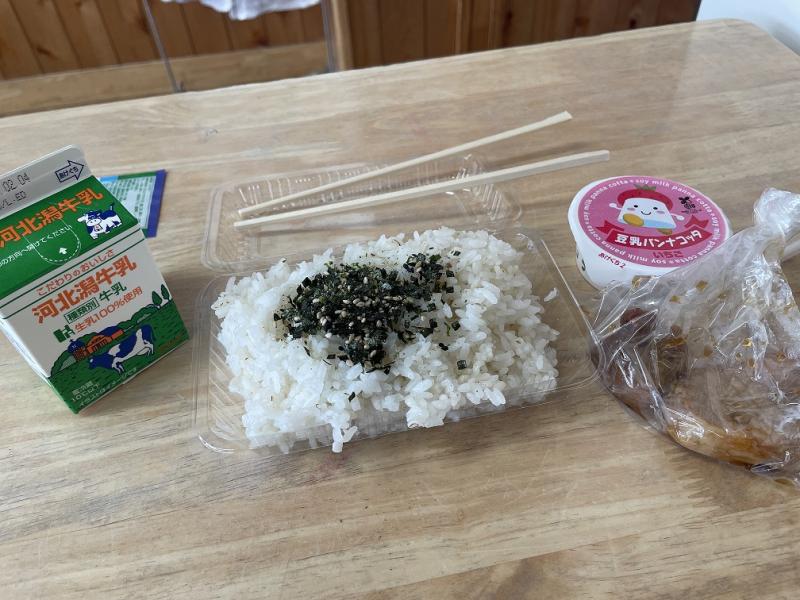 献立は、ご飯、海苔のふりかけ、豚肉、豆乳のパンナコッタ、牛乳です。
