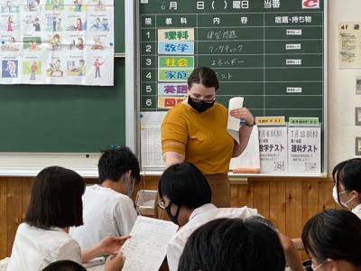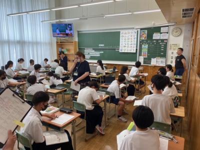 本日、かほく市ALTの研修会が本校で行われました。2年生の英語の授業に3校のALTのセバスチャン先生、ローラ先生、モーリー先生そして生涯学習課のメモフ先生が参加しました。いつもの授業では、セバスチャン先生と英語担当の先生からのアドバイスだけですが、今日は多くのALTの先生からのアドバイスをもらうことができ、大変贅沢な授業となりました。7月13日(木)は、メモフ先生によるドイツ語の読み聞かせが予定されています。