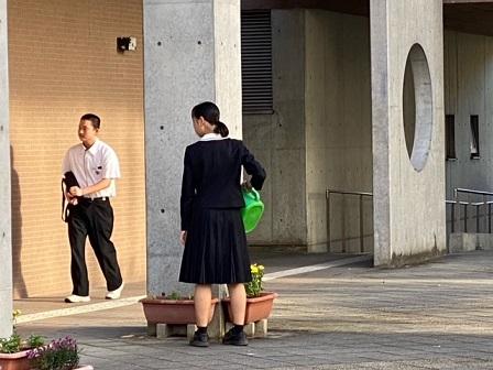 今朝は、環境委員会の生徒が水やりを実施していました。また屋上広場にある花壇の雑草などは、本校のコミュニティ・スクールのコーディネーターである溝口先生が処理をしてくれました。本当にありがとうございます。