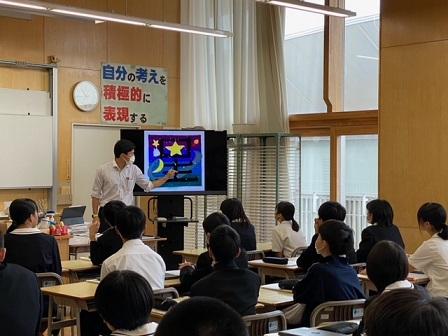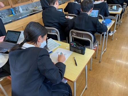 本日1年生の美術では「文字で楽しく伝える」の題材で県教員総合研修センターの岩本先生を招聘して授業が行われました。漢字一字の形や色、構成などを工夫して、楽しく伝える方法を考えました。母の点の部分を顔にしたり、犬の横棒を骨にしたりとワクワクするデザインを考えていました。完成した作品は、校区の小学校に展示する予定となっており、小学生がどのような感想を伝えてくれるか楽しみです。