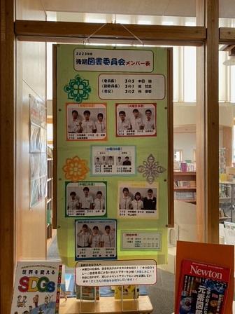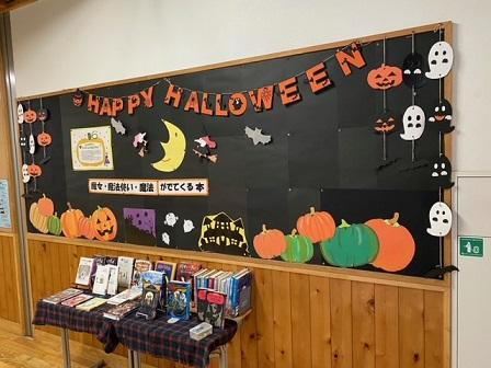 1年生の学級掲示では、紅葉がピークを迎え、もみじや銀杏が赤や黄色などに色づいています。この掲示物は生徒のアイデアで作られているもので、来月には冬の掲示物を作成予定だそうです。また図書館では、ハロウィンの掲示物が登場し、「ハリー・ポッター」や「魔女の宅急便」などハロウィンに関連づけられた読み物も紹介されています。