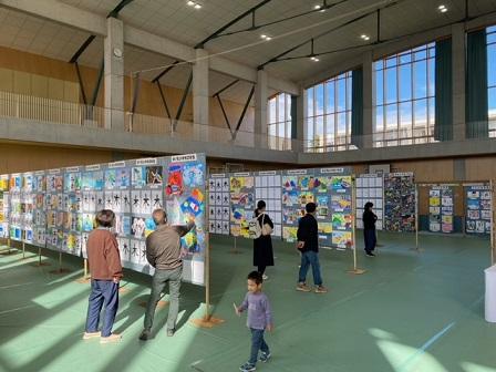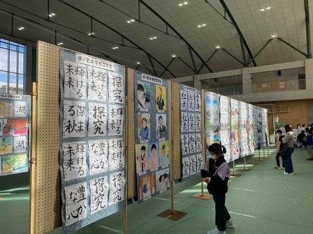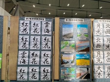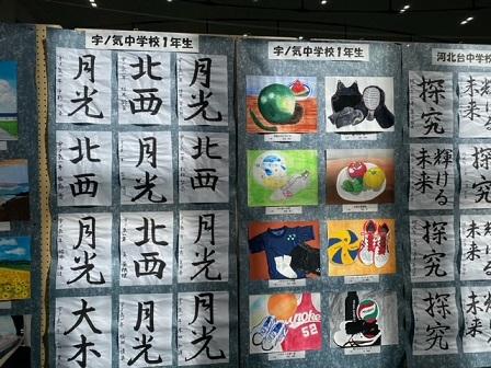 この土日、河北台中学校講堂や中学校体育館にて標記の催しが開催されました。中学校体育館には、かほく市9小中学校の児童生徒が作成した作品も展示されており、3中学校では、美術と国語の授業で作成した作品が展示されています。本校生徒の作品は、習字が36作品、絵画が25作品展示されています。今日はお天気も良く、多くの地域の方々が参加されていました。