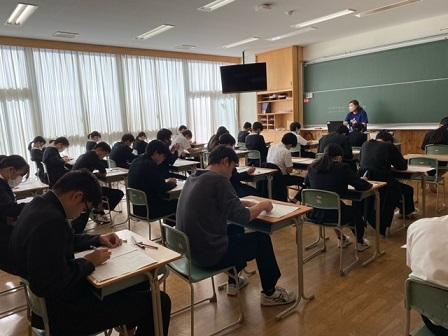 本日、3年生の進路説明会が行われました。令和6年度の入試については大きな変更点はありませんが、進路担当の先生より、入試の概要、受験手続き、今後の日程等、説明がありました。