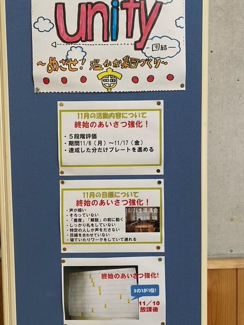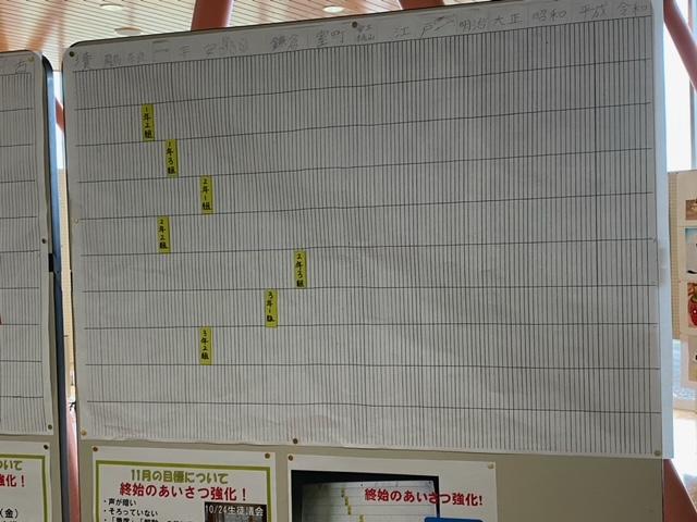 生徒会の取組として「授業の終始のあいさつ強化」を実施しています。これは生徒議会で決まった取組であり、玄関前に掲示されているグラフには各学級で達成した分だけプレートが貼られています。