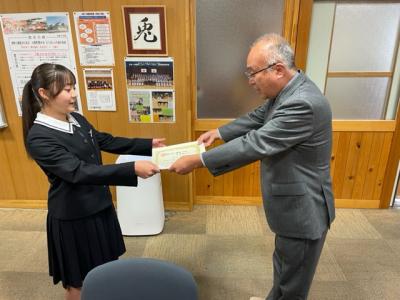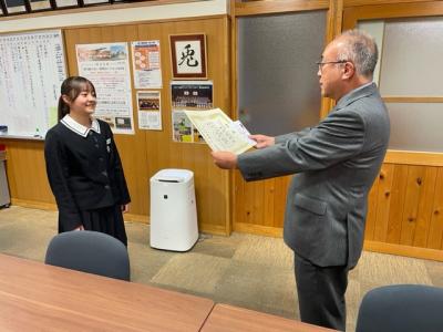 本日、金沢地区納税貯蓄組合連合会会長の金谷道憲様、事務局長の笠森諭様が来校され、河北郡市会長賞を受賞した3年の中野良梛さんに賞状と副賞が手渡されました。