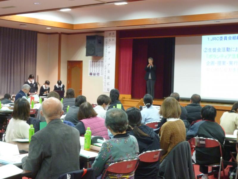 また、JRC委員会のメンバーは、活動のねらいを説明したあと、今年度の活動内容について報告しました。今後、高齢者施設に生徒が描いた色紙と鉢植えを持って訪問する予定となっています。