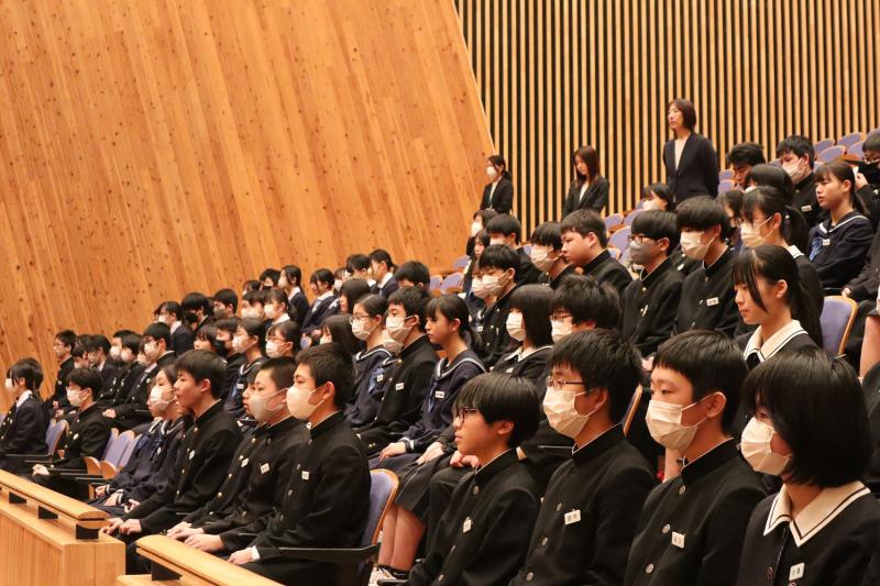 校長先生からは、私立入試が終わった3年生に対して、このあとの1ヶ月、何が何でも合格するんだという強い気持ちで頑張ってほしいとありました。また、ここまでの皆さんの成長は一人一人の頑張りや努力の成果だと思うが、いろんな人に支えられて今の自分があるということを忘れないでほしいこと、そして感謝の気持ちをぜひ行動で表してほしいと話がありました。また1、2年生には、先日の立志式や職業人に学ぶ会を通して、こんな仕事に就きたい、こんな人になりたいなど将来を見つめてほしいと話されました。