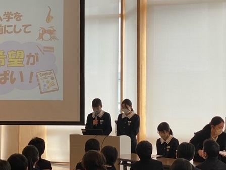 4月から本校の生徒となる児童の皆さんを迎えて、「新入生説明会」が実施されました。生徒指導や学習の担当の先生から説明があった後に、生徒会活動や部活動について2年生の紺谷さんと示野さんから説明がありました。また、6年生に対して、中学校生活についての悩みなどを聞き取ったアンケートの内容について、1年生の保健委員からオススメの対処方法やアドバイスを発表しました。最後に、1年生が製作したウェルカムメッセージを代表の児童に渡しました。
