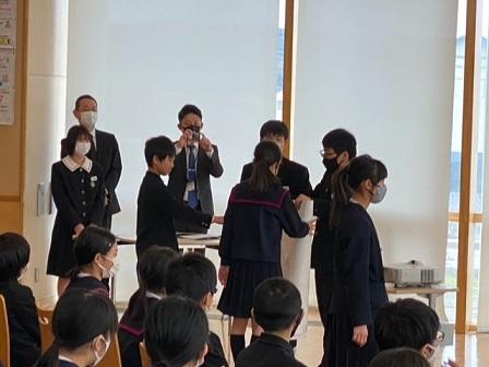 生徒会長からは、「今年度の残りの時間についても、ベル学や挨拶などしっかり取り組んでほしい。3年生は下級生のお手本として有終の美を飾ってほしい」と最後の挨拶を述べました。