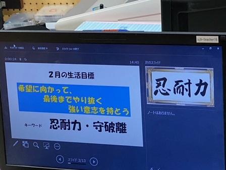 本日、2月の全校集会は、感染防止対策のためにオンラインでの集会となりました。
