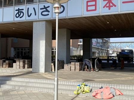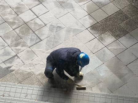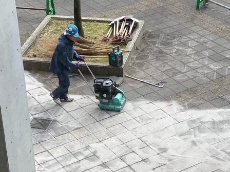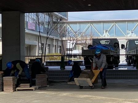 また、生徒玄関前のピロティーの修復工事が着々と進んでいます。一つ一つのブロックを種類ごとに並べ、そして固めるという大変な作業ですが、あっという間に仕上げに入っており、プロの技に驚いています。業者の皆様ありがとうございます。明日も晴れることを願っています。