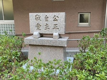 能登半島地震により倒れてしまった、校訓「公正・自主・敬愛」が刻まれた石碑が元の位置に1ヶ月半ぶりに戻ってきました。以前の石碑の下にコンクリートの土台が付けられて、安定した石碑になりました。