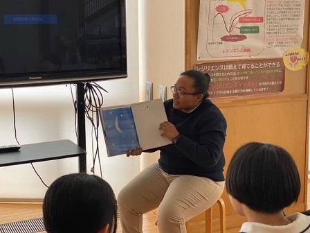 本日、ALTのアニーシャ先生による読み聞かせが行われました。今日の絵本は、「パパ、お月さまとって!」というなんとも可愛い題名の絵本です。
