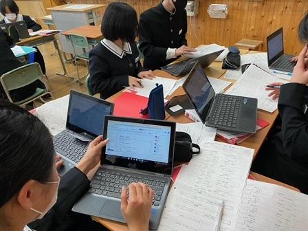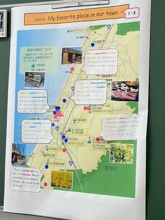 1年生の英語の授業では、「私たちが暮らすかほく市を紹介する」という学習を行っていました。「meat shop Imaeda(お肉の今枝さん)」「roadside station (道の駅高松)」「sunflower field(ひまわり村)」など市内の様々な場所を紹介する英文を考えていました。今枝さんには、たくさんの種類のお肉がある・・・、道の駅高松には、地元の野菜が販売されている・・・など友達と考えたり、端末を使って調べたりしていました。このあとは、ALTのアニーシャ先生に伝えることができるように練習をします。