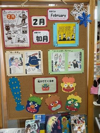 また図書室前の掲示板は2月の掲示物が登場しました。「鬼に金棒」「わたる世間に鬼は無し」など鬼に関することわざや「鬼滅の刃」や「人食い鬼モーリス」など鬼の本が紹介されています。期末テストが終わった1,2年生の皆さん、ぜひ本を借りてください。