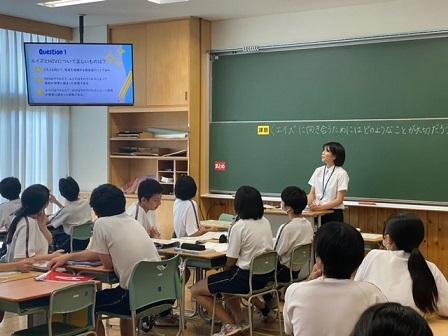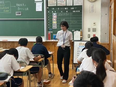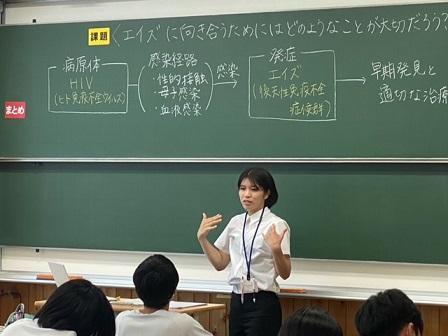 教育実習生の気谷先生が保健の研究授業を行いました。大学の担当の先生も参観に来ておられ、大変緊張したことと思います。単元は「感染症の予防」でエイズについての疾病の概念や感染経路など難しい部分が多かったと思いますが、3年2組の生徒は真剣に考えていました。ICTの工夫そして、グループ活動を通して自分の意見を持つことができた生徒もおり、大変良い授業だったと思います。気谷先生、お疲れ様でした。